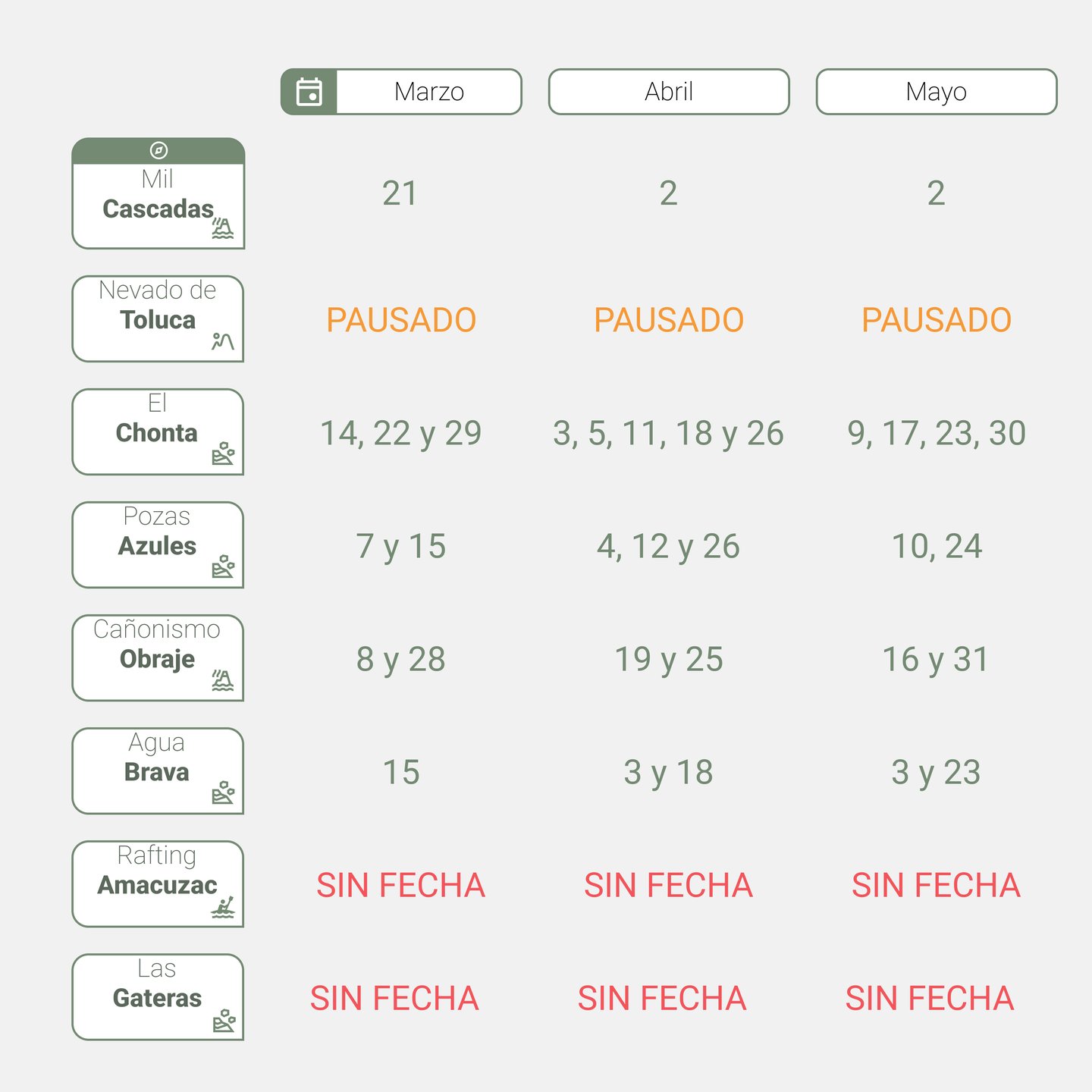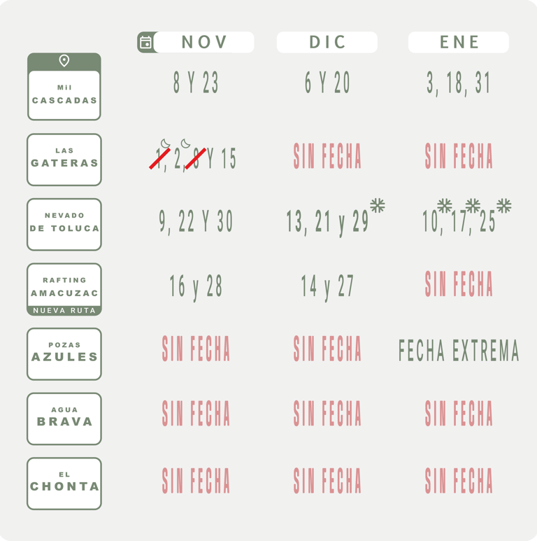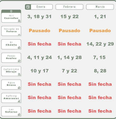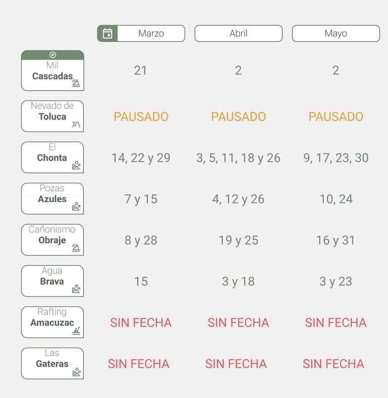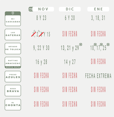 Te mostramos un calendario general de nuestros recorridos, las fechas se van actualizando continuamente.