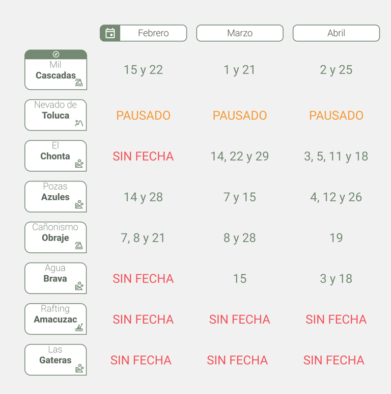 Te mostramos un calendario general de nuestros recorridos, las fechas se van actualizando continuamente.